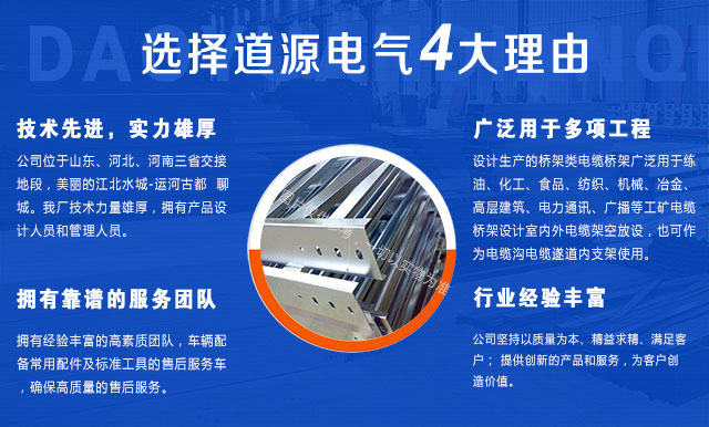 山东道源电气设备有限公司 是电缆桥架生产厂家,公司总厂部位于山东、河北、河南三省交接地段,美丽的江北水城-运河古都 聊城,交通便利。我厂技术力量雄厚,拥有产品设计人员,并有管理人员,我厂设计生产的桥架类电缆桥架广泛用于练油、化工、食品、纺织、机械、冶金、高层建筑、电力通讯、广播等工矿电缆桥架设计室内外电缆架空放设,也可作为电缆沟电缆遂道内...